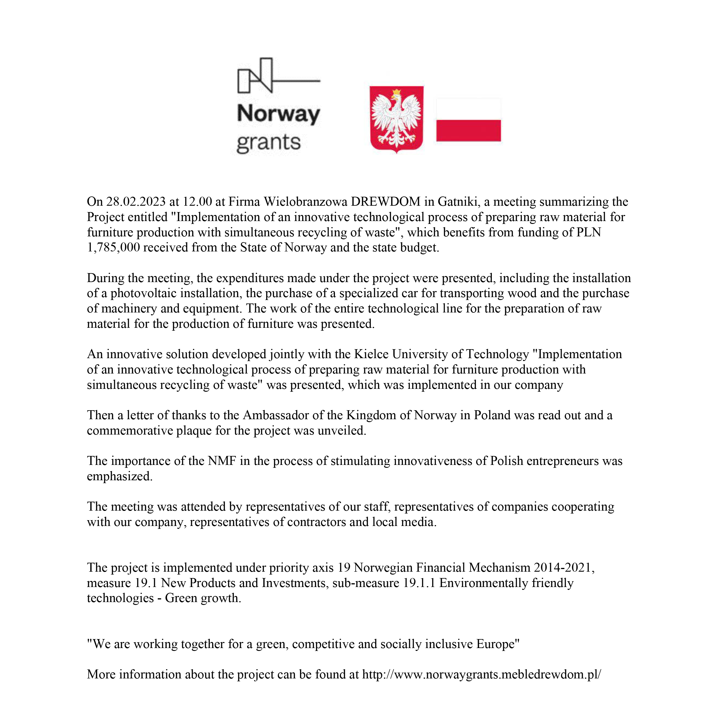 On February 28, 2023 at 12.00 pm in Firma Wielobranzowa DREWDOM in Gatniki, a meeting summarizing the Project will be held. "Implementation of an innovative technological process of preparing raw material for furniture production with simultaneous recycling of waste", which benefits from funding of PLN 1,785,000 received from the State of Norway.
